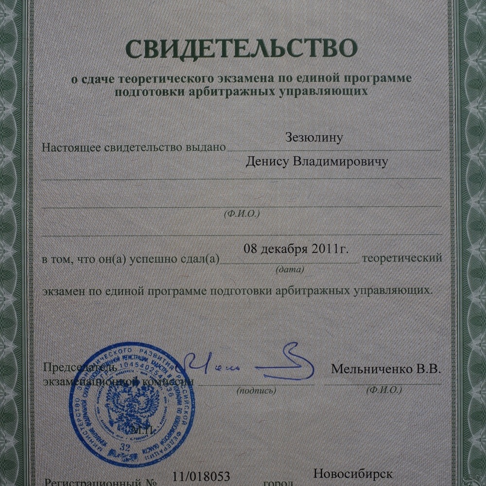 В 2011 году успешно сдал экзамен на Арбитражного управляющего;